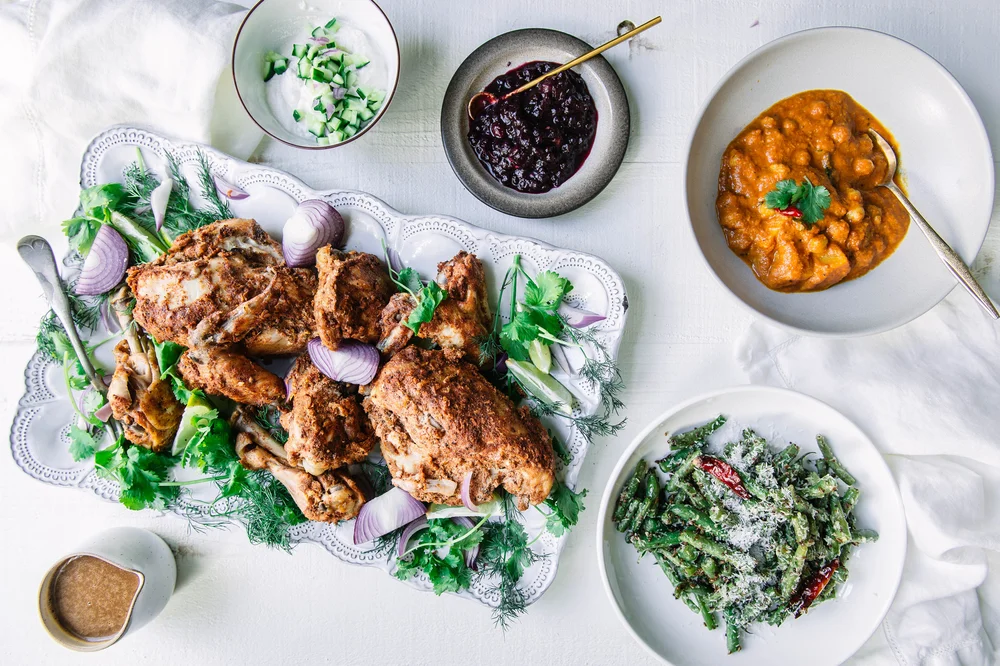 All Indian Thanksgiving Dinner Roast Chicken Spiced Potatoes Mint Coriander Rice Youtube
